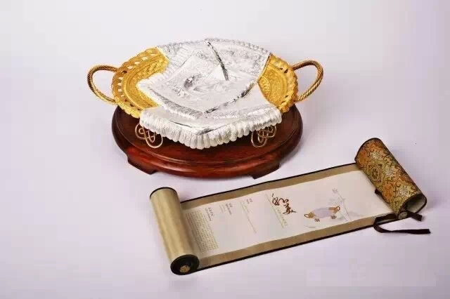 《和美》純銀絲巾果盤造型來(lái)源于中國(guó)傳統(tǒng)的竹編果籃,其上披一條柔軟的江南絲巾,四足則為由銀絲編制的具有中國(guó)特色的中國(guó)結(jié)造型。千錘百煉制造出這栩栩如生的效果,東方匠人用自己出神入化的手工技藝,令21世紀(jì)的偉大發(fā)明3D打印技術(shù)相形見(jiàn)絀。這果盤是由整塊足銀材料經(jīng)過(guò)上千萬(wàn)次的純手工鏨刻而成。此件作品由中國(guó)工藝美術(shù)大師純手工制作,造型逼真、鏨刻細(xì)膩。精美絕倫之處更在于它以貴金屬材質(zhì)展現(xiàn)出了絲綢的質(zhì)感,尤其是絲巾細(xì)節(jié)之處的縷縷絲線和竹籃的藤條肌理效果的處理,既凸顯了絲巾的柔軟與細(xì)膩,又展現(xiàn)了竹籃的古樸與自然的視覺(jué)感受,是中國(guó)傳統(tǒng)鏨刻工藝作品中的一件藝術(shù)精品。